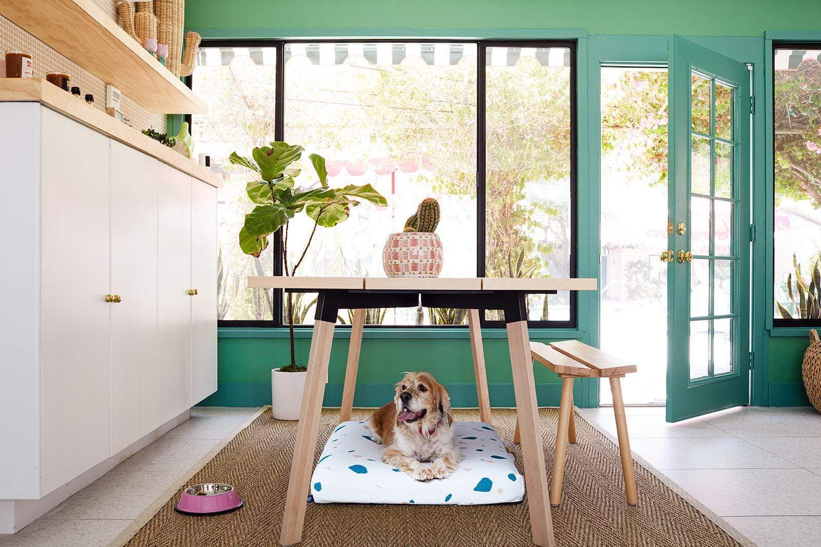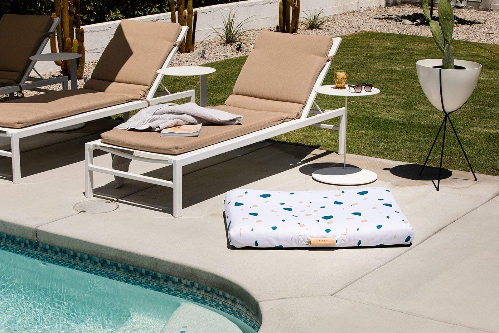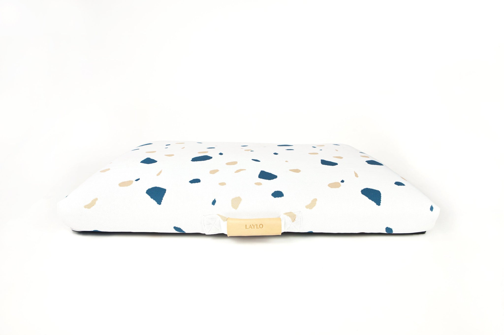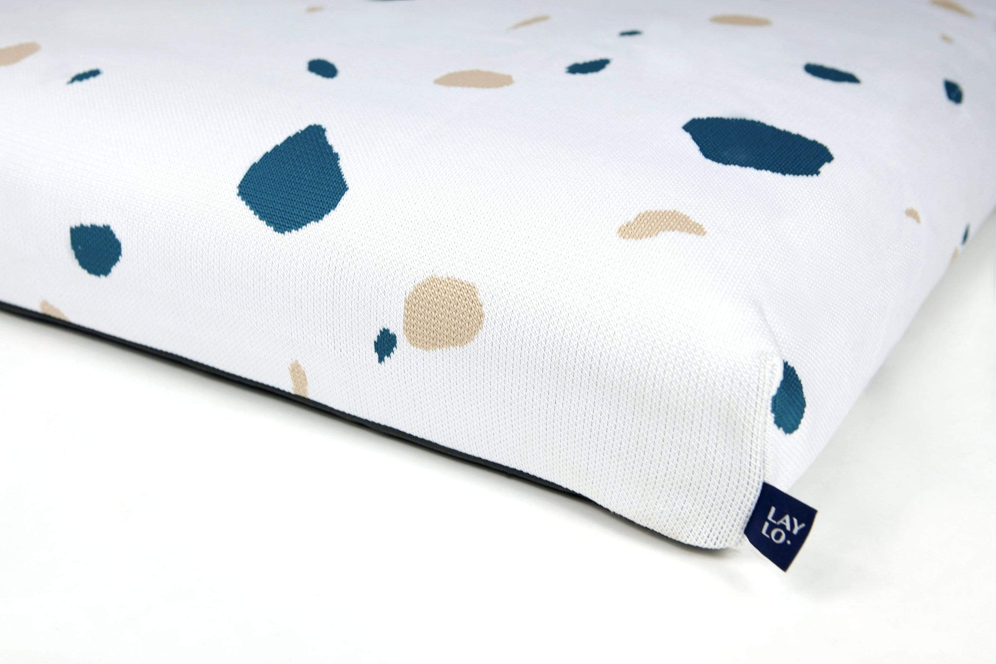 The White Terrazzo print is a modernist take on a mid century modern white dog bed with hints of teal and beige. Inspired by Italian terrazzo, a classic material that has undergone a renaissance among design enthusiasts, this mid century modern dog bed brings a graphic and serene dimension to any space.