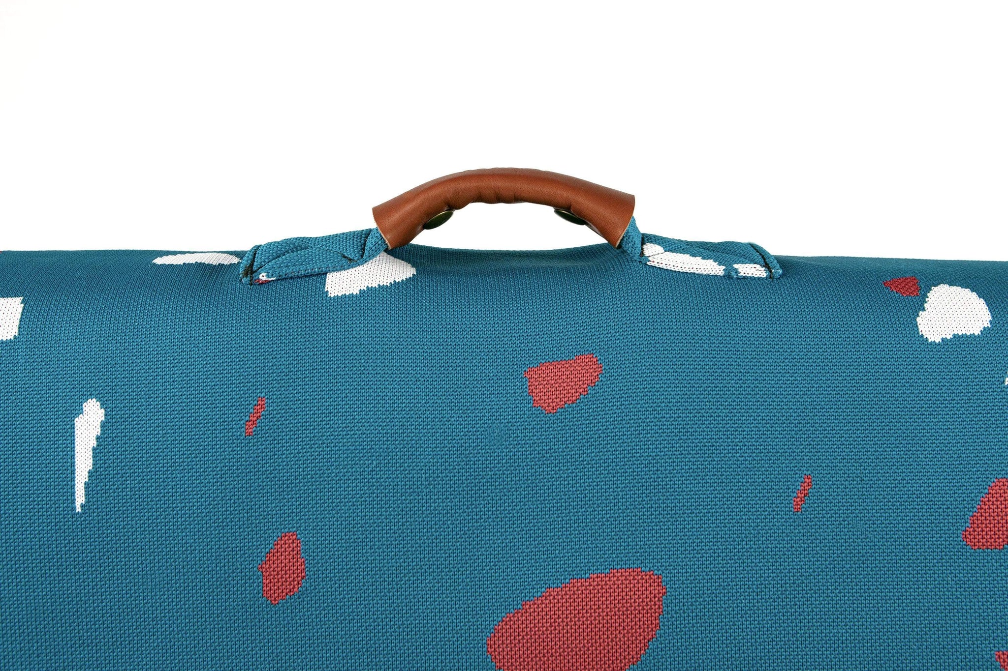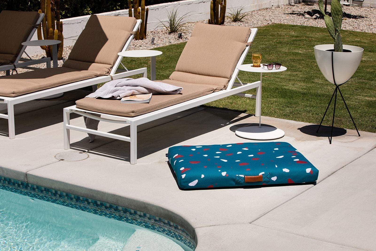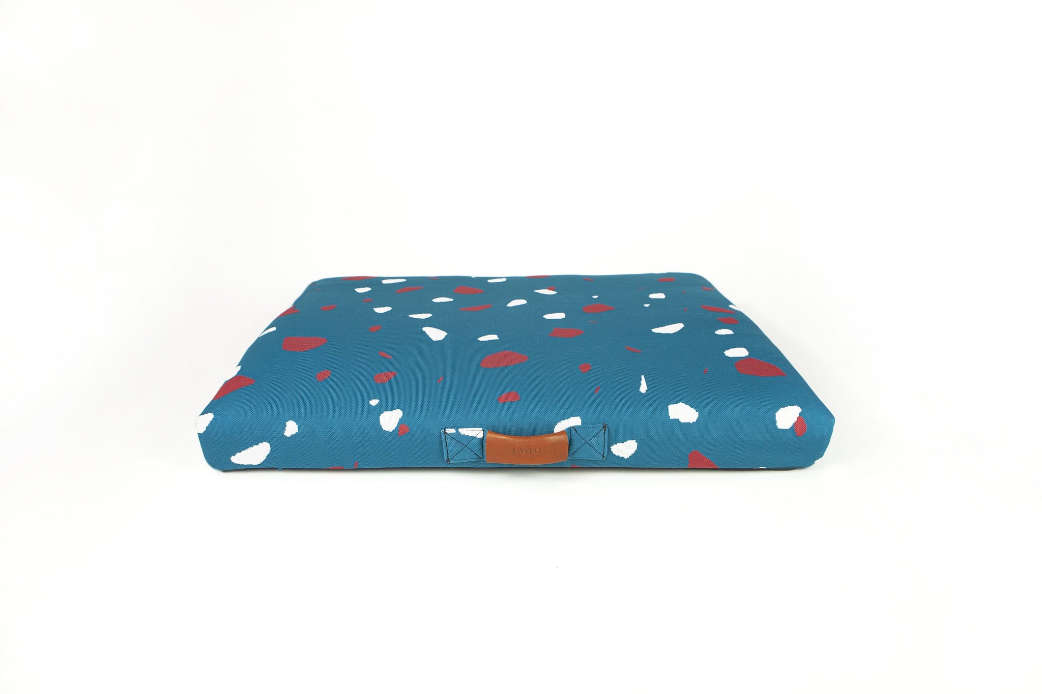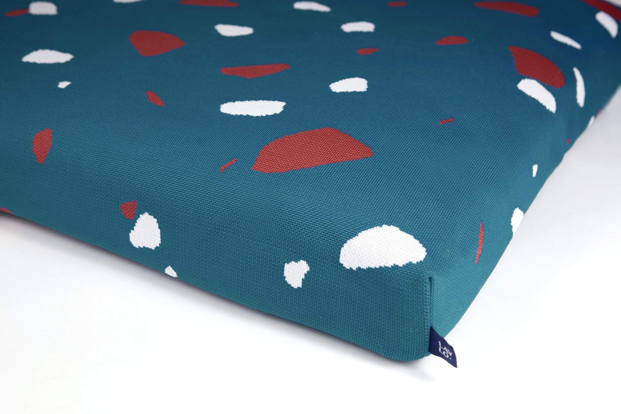 The Teal Terrazzo print is a modernist take on a blue dog bed with hints of white and maroon. Inspired by Italian terrazzo, a classic material that has undergone a renaissance among design enthusiasts, this mid-century modern dog bed brings a graphic and serene dimension to any space.